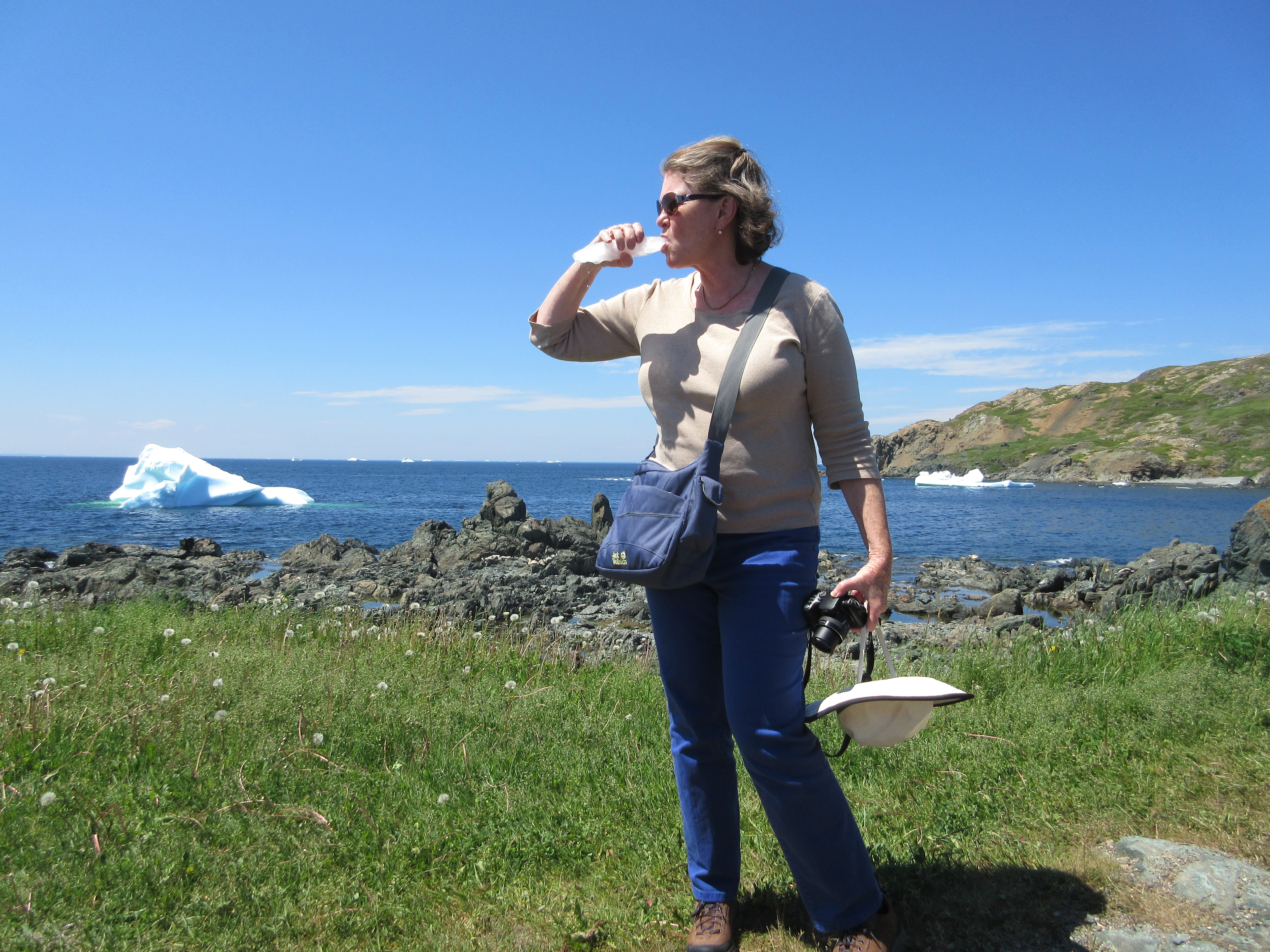 It was as much fun hiking along the shore to look at the icebergs that had grounded in the shallow waters in the coves and out at sea. On one hike, we stopped counting after 100 icebergs. Instead of water bottles, we carried chunks of 10,000 year old ice scooped from the sea around the grounded bergs.